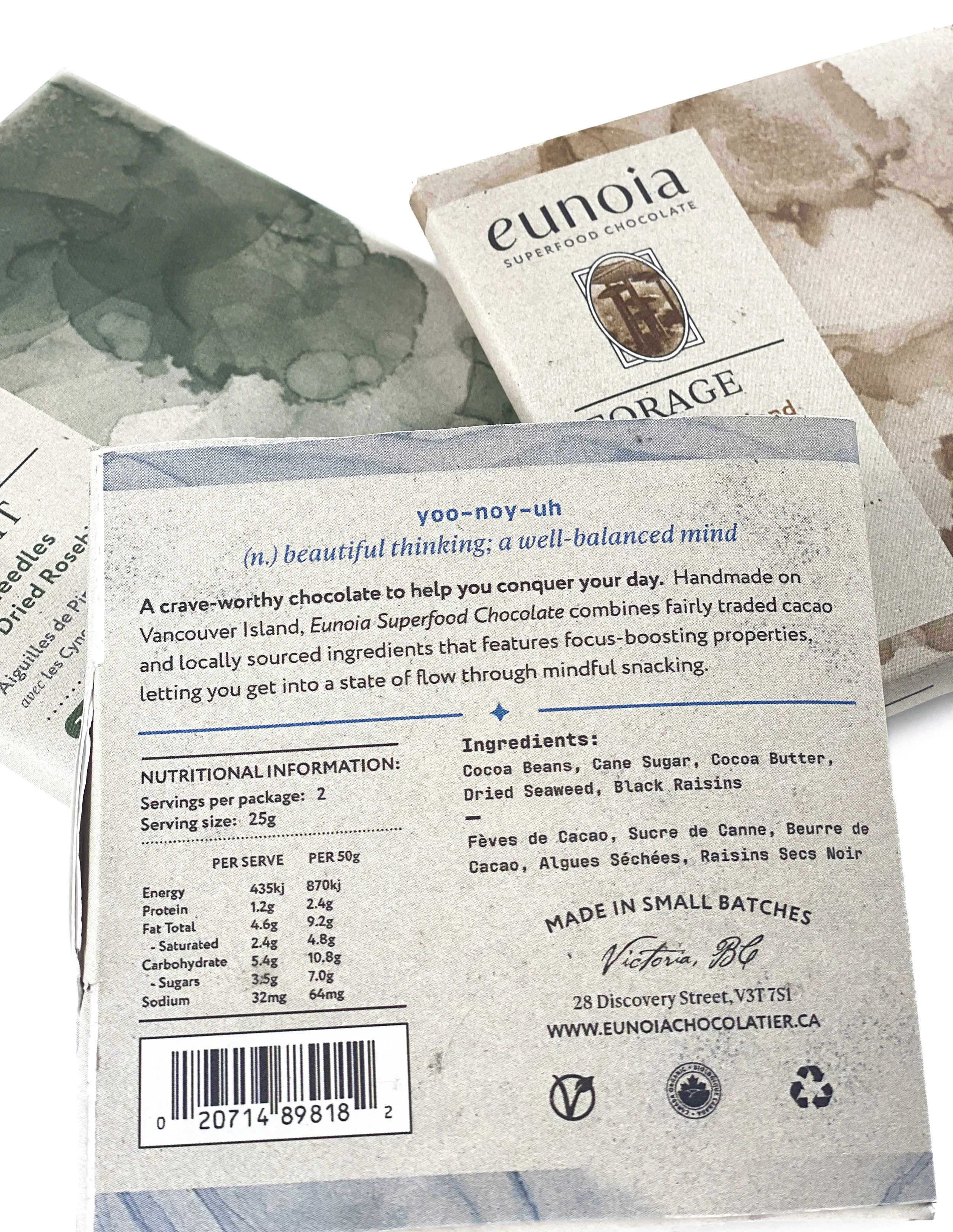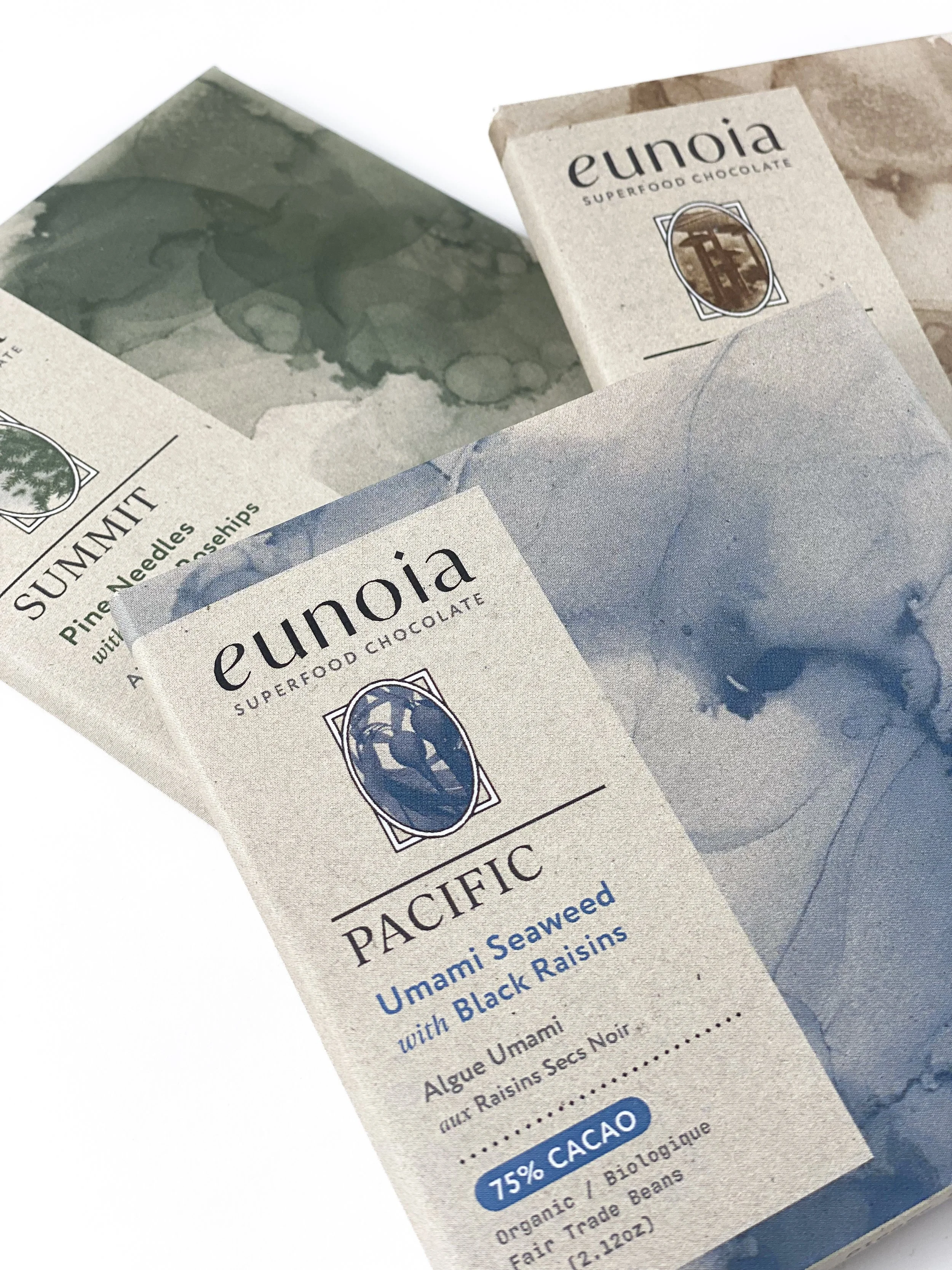 In designing Eunoia’s packaging, I focused on three core values: environmental commitment, heritage, and innovation. I ensured the packaging seamlessly fits into boutique stores while still standing out in grocery stores through minimalist colours and typography. Hand-crafted illustrations and eco-friendly materials convey the handmade quality of the chocolates, with affirmations on the packaging reinforcing the brand’s message.