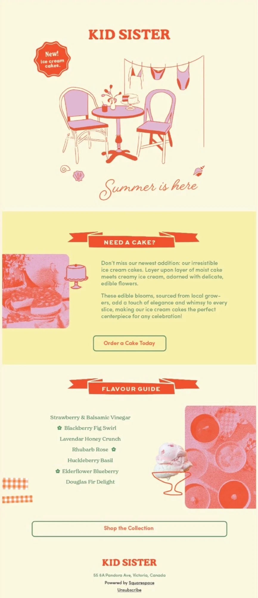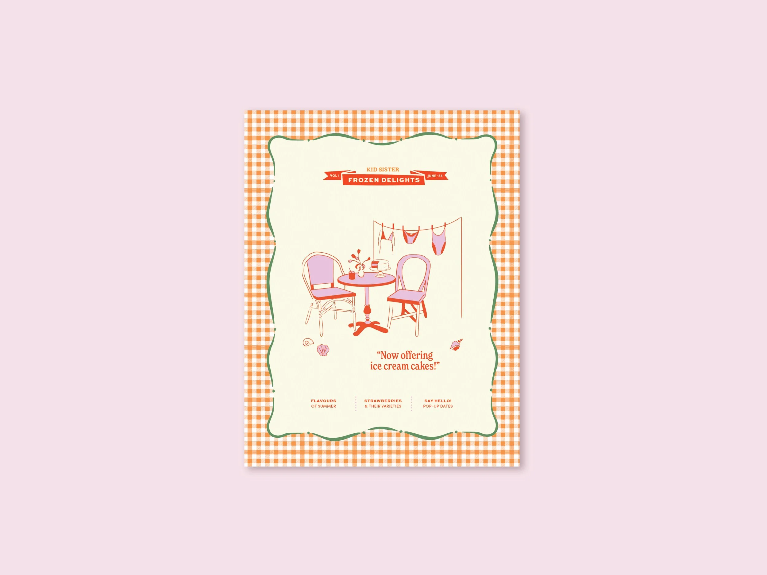 THE RESULTIllustrations were kept simple utlizing a monoline style, with four main typefaces incorporated, including a vintage baker-inspired font and a handwritten script. There are halftone texturized photographic visuals in a punchy pink and orange for a summer vibe, and quirky elements were added, such as gingham patterns, banners, and polaroids to enhance the brand’s fun and carefree image.
