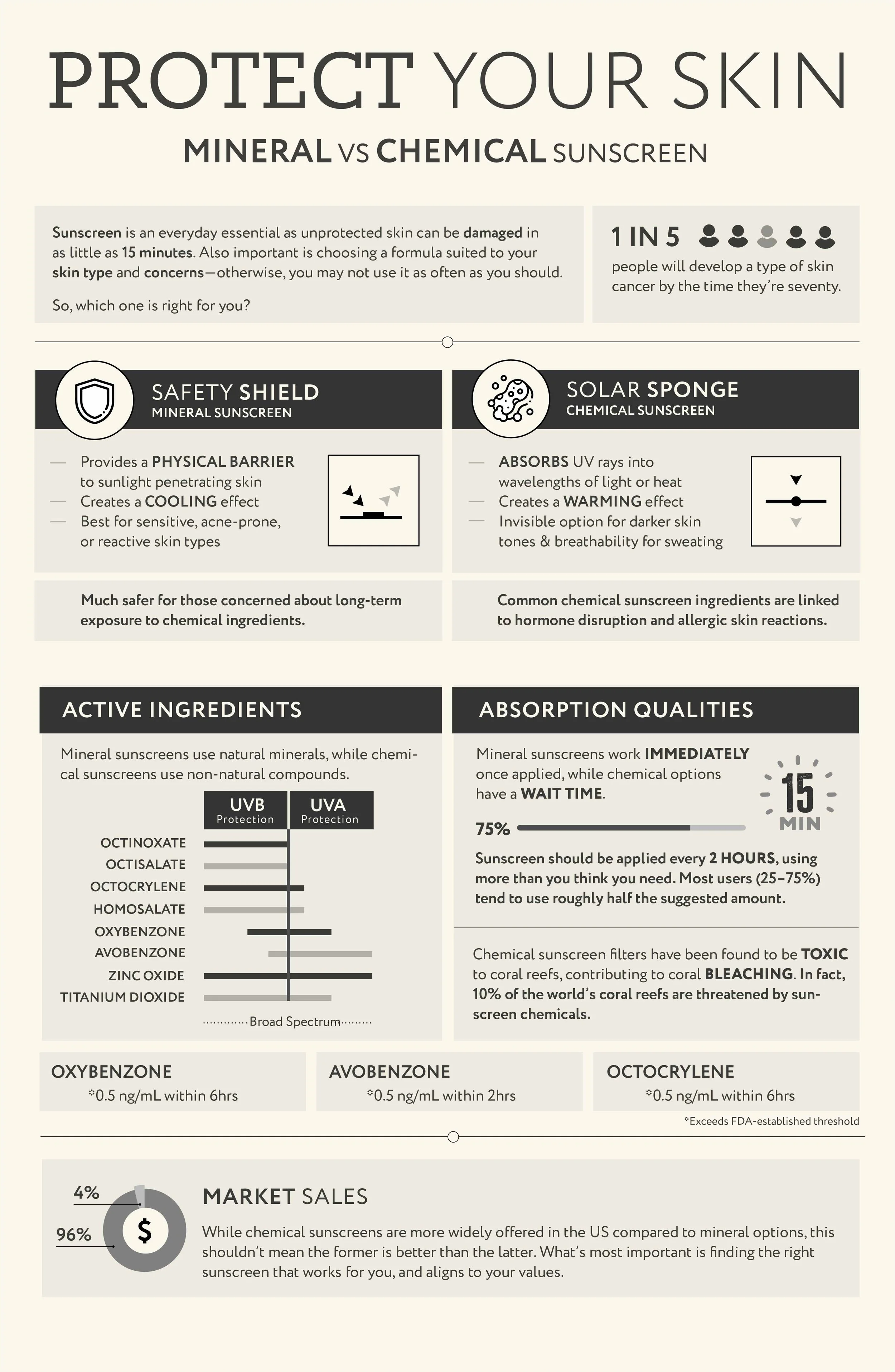 THE APPROACHA thorough research phase laid the foundation for this project. This involved delving into the scientific literature to understand the nuances between chemical and mineral sunscreens, as well as their respective benefits and drawbacks. Once armed with this knowledge, the next step involved extracting the most important information into charts, graphs, and illustrations, prioritizing clarity and simplicity to convey complex concepts.